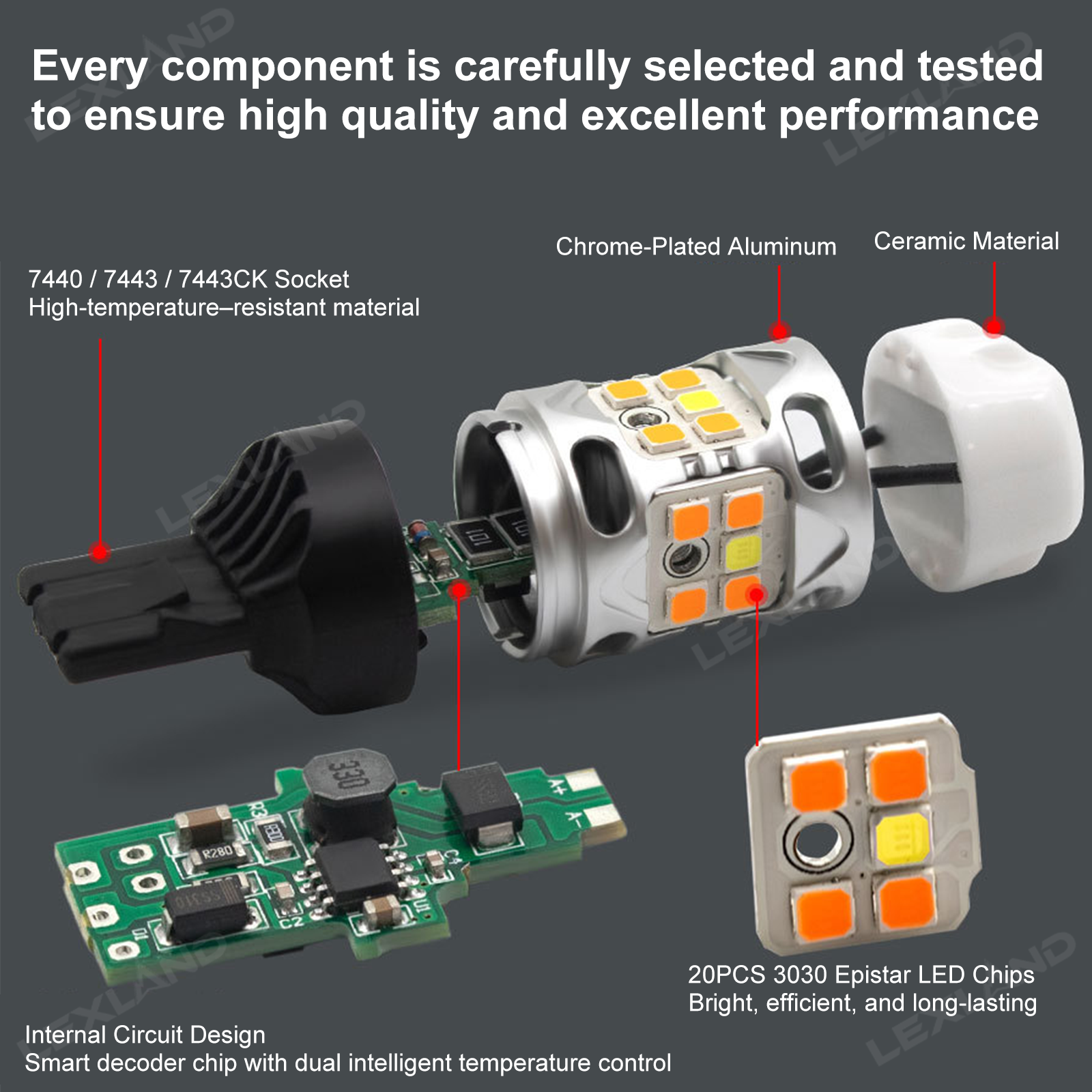Stable Performance: The new 7443 LED bulbs feature an Intelligent Thermal Control System (ITCS) to maintain stable performance even in high-temperature environments. The bulbs are made with a textured aluminum housing and internal heat sinks to improve heat dissipation and extend lifespan.